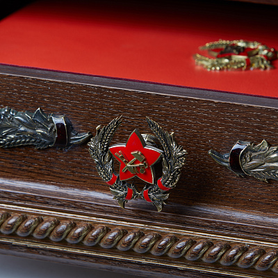 Книга помещена в короб из натурального дерева, обитый бархатом и инкрустированный латунными элементами с эмалью. Короб украшают модели техники и фигурки военнослужащих Красной армии, форма которых точно соответствует Уставу Вооруженных сил, в руках – вышитые флаги войсковых подразделений.