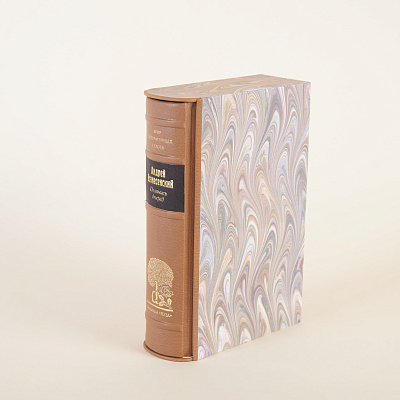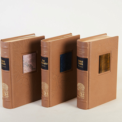 Книга облечена в переплет ручной работы из кожи производства компании J. Hewit & Sons (Великобритания) со вставками из натуральных камней. Каждому тому соответствует свой камень.