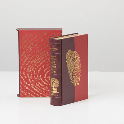 Книга облечена в переплет из кожи Sirpel Vicenza итальянского производства. Тиснение золотом 24К, обрез золоченый, футляр обтянут бумагой с тиснением золотом.