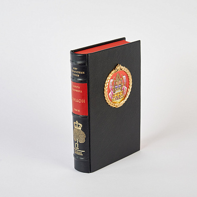 Книга в кожаном переплете ручной работы. На первой сторонке — медальон, выполненный художниками вручную и заключенный в рамку из латуни с эмалью. Живописное изображение на медальоне соответствует содержанию каждого тома. По переплету тиснение золотом 24 карата.