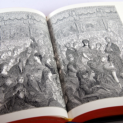 Каждый том помещен в футляр, который запечатан сюжетной иллюстрацией (гравюра) с тиснением золотом.