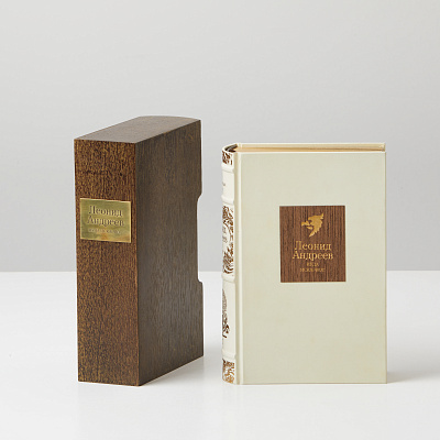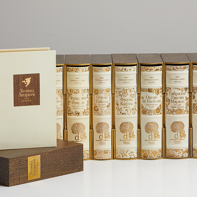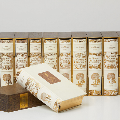 Возможны два варианта оформления переплета: из цельной кожи или пергамена. Каждая книга в футляре. Тиснение золотом 24К. Обрез золоченый