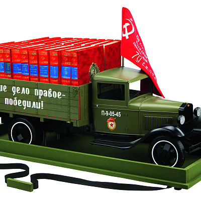 Книги помещены в модель знаменитой полуторки, легендарного советского грузовика, изготовленной из дерева, пластика и ткани.
