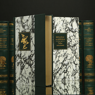 Книга облечена в составной переплет из кожи Russels (Великобритания). Тиснение золотом 24K. Обрез золоченый, футляр обтянут мраморной бумагой RELMA (Франция) с тиснением золотом.