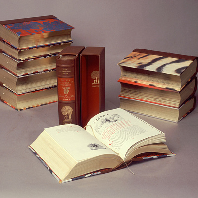 Книга облечена в составной переплет: кожа Bibliofile Ziegen Leder и муаровый переплетный шелк Comtesse с офсетной печатью. Тиснение золотом 24К, обрез золоченый, футляр обтянут кожей с тиснением золотом.