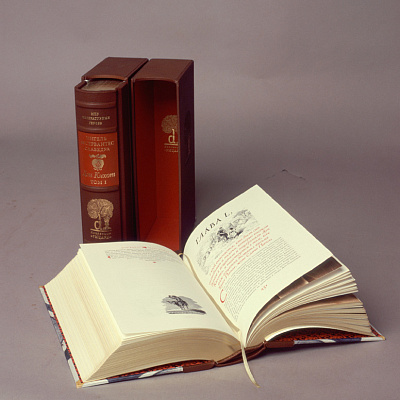 Книга облечена в составной переплет: кожа Bibliofile Ziegen Leder и муаровый переплетный шелк Comtesse с офсетной печатью. Тиснение золотом 24К, обрез золоченый, футляр обтянут кожей с тиснением золотом.