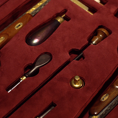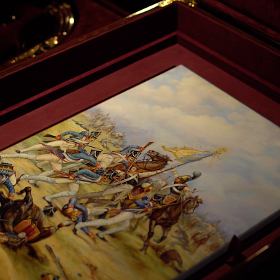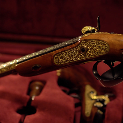 В комплект входит пистолетная пара – точная копия дуэльных пистолетов М.Ю. Лермонтова и Н.С. Мартынова. Пистолеты изготовлены из ценных пород дерева и вручную инкрустированы драгоценными металлами.