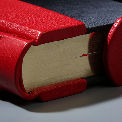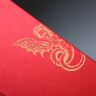 Книга облечена в составной переплет: кожа Bibliofile Ziegen Leder и переплетный шелк Comtesse. Вставка-цветок на обложке – гравюра ручной работы, выполненная в технике офорта Тиснение золотом 24К, обрез золоченый, футляр обтянут кожей с тиснением золотом.