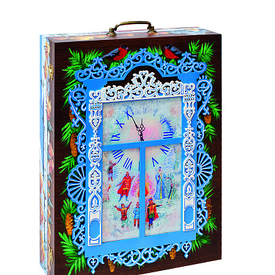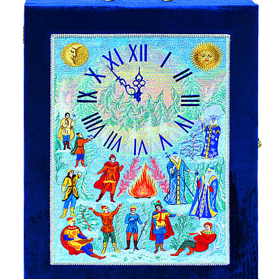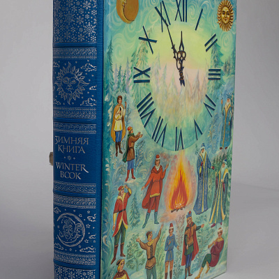 Переплет из кожи с серебряным тиснением декорирован панно Федоскино с изображением героев сказки «Двенадцать месяцев».