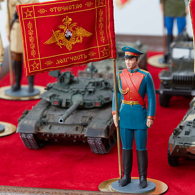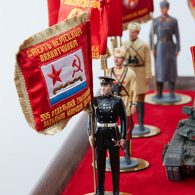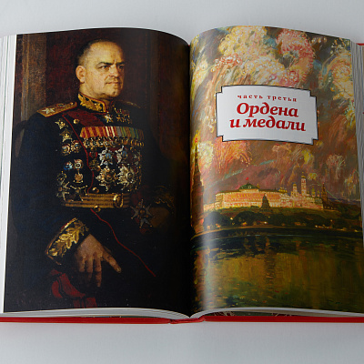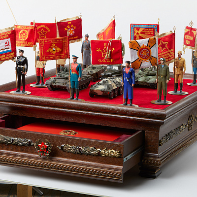 Книга помещена в короб из натурального дерева, обитый бархатом и инкрустированный латунными элементами с эмалью. Короб украшают модели техники и фигурки военнослужащих Красной армии, форма которых точно соответствует Уставу Вооруженных сил, в руках – вышитые флаги войсковых подразделений.
