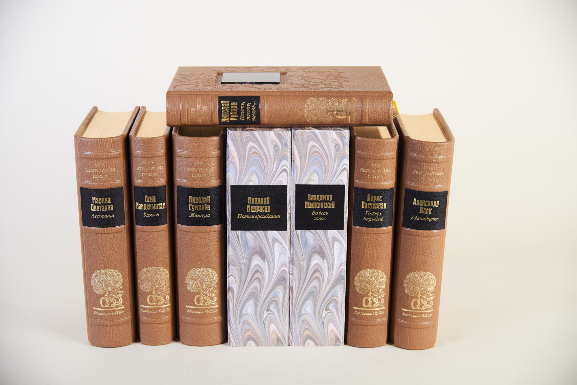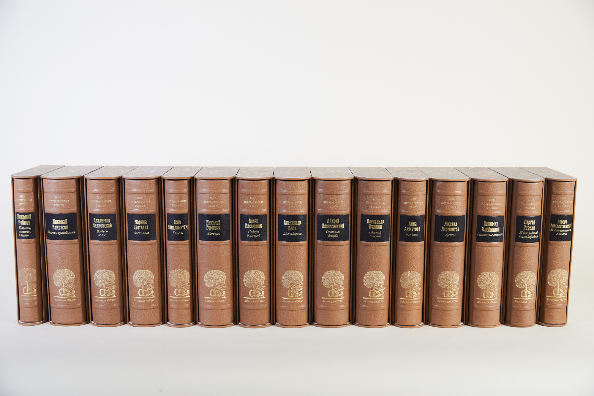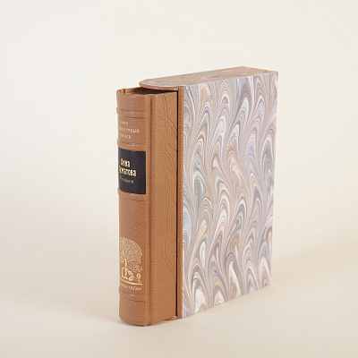 Книга облечена в переплет ручной работы из кожи производства компании J. Hewit & Sons (Великобритания) со вставками из натуральных камней. Каждому тому соответствует свой камень.