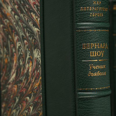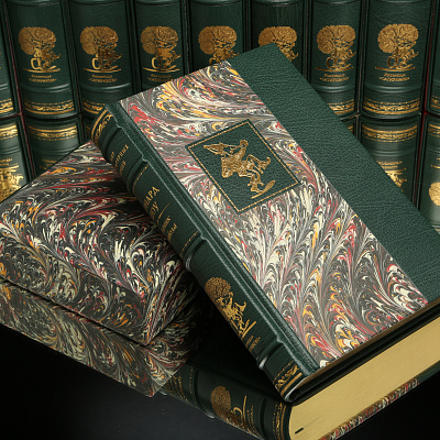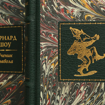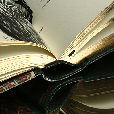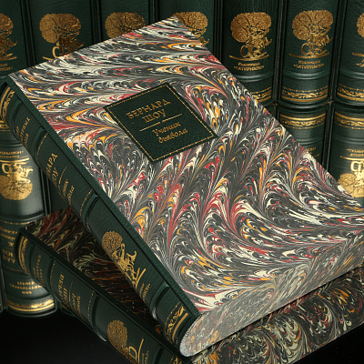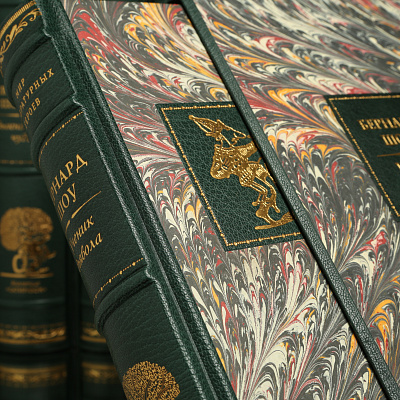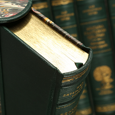 Книга облечена в составной переплет из кожи Russels (Великобритания). Тиснение золотом 24K. Обрез золоченый, футляр обтянут мраморной бумагой RELMA (Франция) с тиснением золотом.