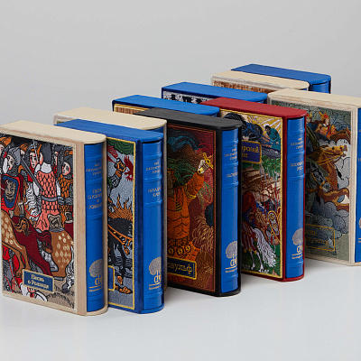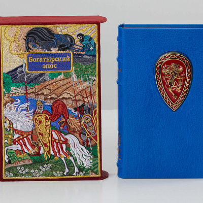 Переплеты ручной работы из кожи. Каждый том коллекции «Эпос» вручную декорирован бронзовым щитом, соответствующим содержанию книги: щиты Карла Великого, русского богатыря, индийского раджи и другие изготовлены с учетом мельчайших деталей и украшены эмалью, кожей и прочими эксклюзивными материалами.