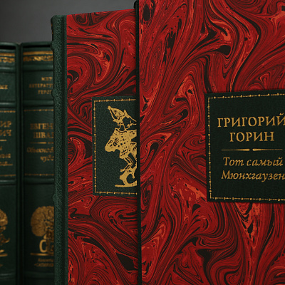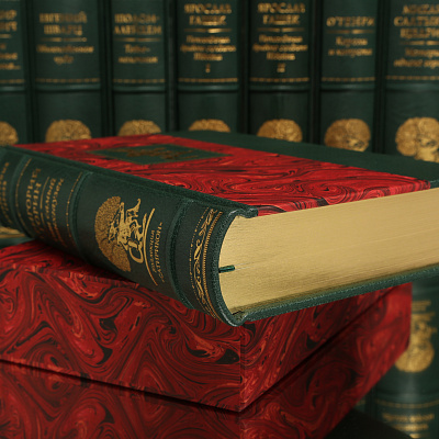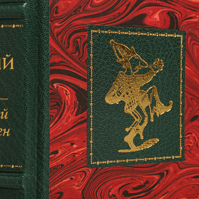 Книга облечена в составной переплет из кожи Russels (Великобритания). Тиснение золотом 24K. Обрез золоченый, футляр обтянут мраморной бумагой RELMA (Франция) с тиснением золотом.