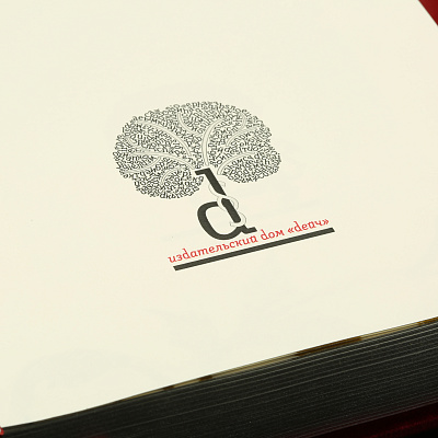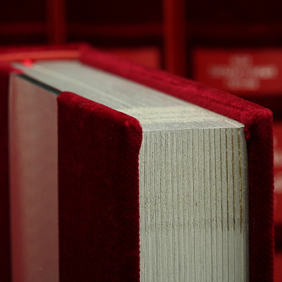 Книга облечена в переплет из бархата Tessile Ricciardi (Venezia) с накладкой из алюминия. На корешке вставки из кожи с тиснением серебряной фольгой. Обрез серебрённый. Футляр обтянут кожей с тиснением.