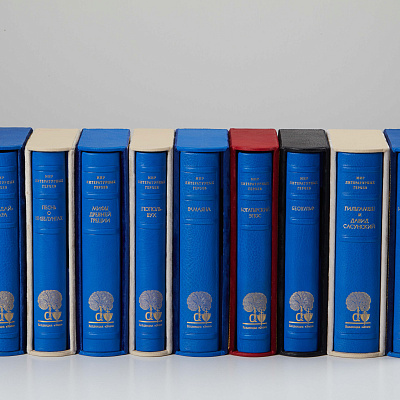 Переплеты ручной работы из кожи. Каждый том коллекции «Эпос» вручную декорирован бронзовым щитом, соответствующим содержанию книги: щиты Карла Великого, русского богатыря, индийского раджи и другие изготовлены с учетом мельчайших деталей и украшены эмалью, кожей и прочими эксклюзивными материалами.