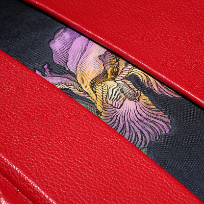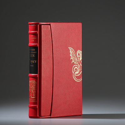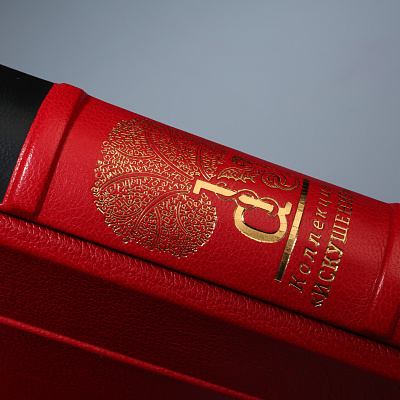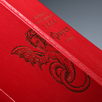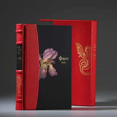 Книга облечена в составной переплет: кожа Bibliofile Ziegen Leder и переплетный шелк Comtesse. Вставка-цветок на обложке – гравюра ручной работы, выполненная в технике офорта Тиснение золотом 24К, обрез золоченый, футляр обтянут кожей с тиснением золотом.