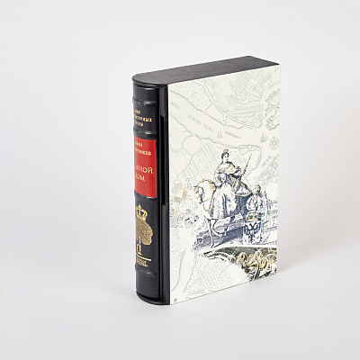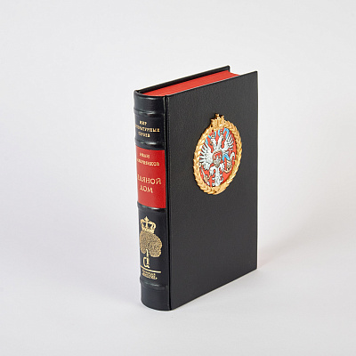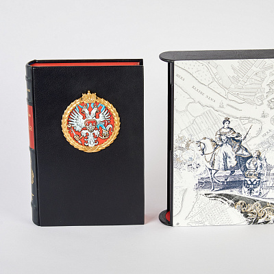 Книга в кожаном переплете ручной работы. На первой сторонке — медальон, выполненный художниками вручную и заключенный в рамку из латуни с эмалью. Живописное изображение на медальоне соответствует содержанию каждого тома. По переплету тиснение золотом 24 карата.