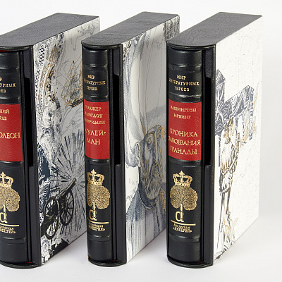Каждый том помещен в футляр, который запечатан сюжетной иллюстрацией (гравюра) с тиснением золотом.