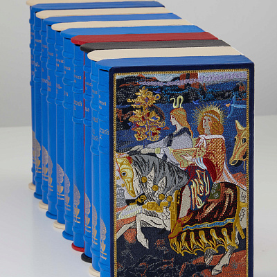 На футлярах томов вышиты сюжеты эпосов. Основой для богатой многоцветной вышивки стали рисунки с древнегреческой амфоры, из средневековой летописи, историческая живопись.