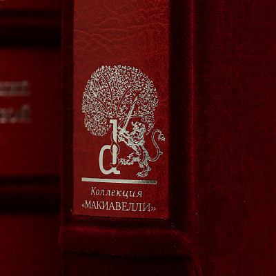 Книга облечена в переплет из бархата Tessile Ricciardi (Venezia) с накладкой из алюминия. На корешке вставки из кожи с тиснением серебряной фольгой. Обрез серебрённый. Футляр обтянут кожей с тиснением.