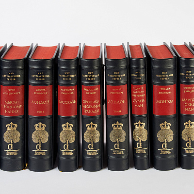 Книга в кожаном переплете ручной работы. На первой сторонке — медальон, выполненный художниками вручную и заключенный в рамку из латуни с эмалью. Живописное изображение на медальоне соответствует содержанию каждого тома. По переплету тиснение золотом 24 карата.