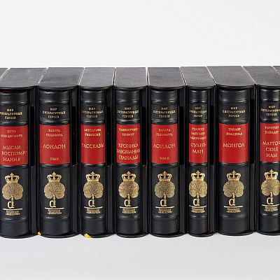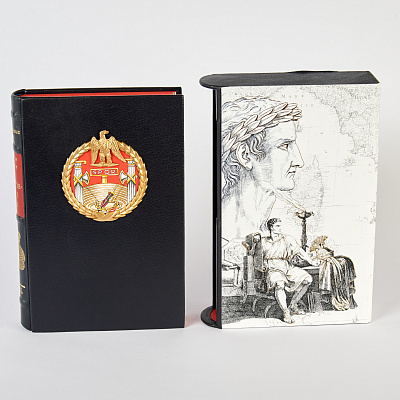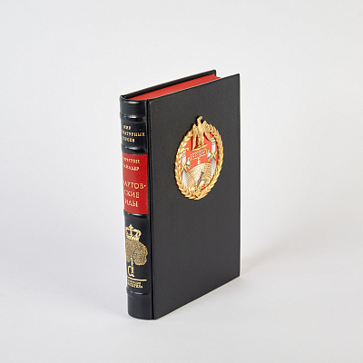 Книга в кожаном переплете ручной работы. На первой сторонке — медальон, выполненный художниками вручную и заключенный в рамку из латуни с эмалью. Живописное изображение на медальоне соответствует содержанию каждого тома. По переплету тиснение золотом 24 карата.