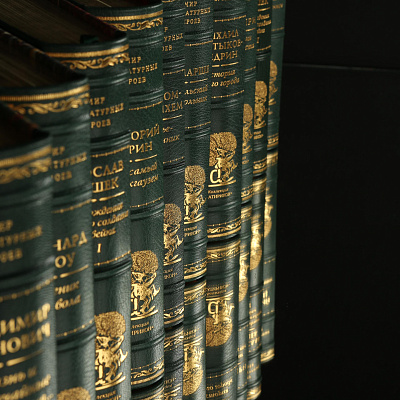 Книга облечена в составной переплет из кожи Russels (Великобритания). Тиснение золотом 24K. Обрез золоченый, футляр обтянут мраморной бумагой RELMA (Франция) с тиснением золотом.